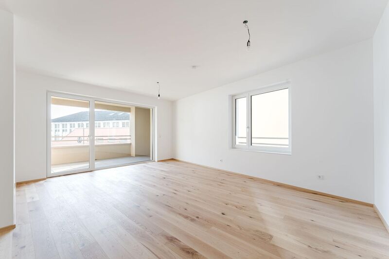 Die 4-Zimmer-Wohnung C21 befindet sich im Baukörper C und beinhaltet alle Elemente die eine große und moderne Eigentumswohnung haben muss. Ein großzügiger Vorraum, ein Abstellraum, 2 Schlafzimmer, ein Bad mit Badewanne, ein separates WC und eine offen gestaltete Wohnküche. Das Highlight der Wohnung ist das großzügige Wohnzimmer mit Wohnküche, welches Platz für eine gemütliche Couch und einen großen Esstisch bietet. Anschließend befindet sich die Loggia.